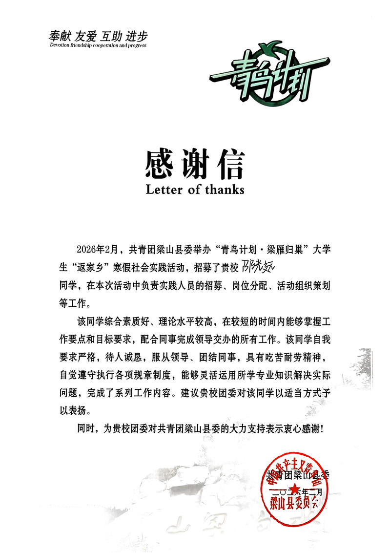 此次“青鸟计划·梁雁归巢”返家乡社会实践,是我走出校园、接触社会的宝贵经历,让我在服务家乡的过程中实现了自我成长与提升。这段时光里,我不仅为家乡的公共文化建设贡献了自己的一份力量,更深刻体会到了社会实践的重要意义,明白了青年一代应有的责任与担当。我也认识到,校园知识只有与基层实践相结合,才能真正发挥价值,我将以“青鸟”归巢的初心,持续关注家乡的建设与发展,用实际行动诠释青春担当,努力为家乡的发展贡献更多青春力量,让青春之花在家乡的土地上绚丽绽放。