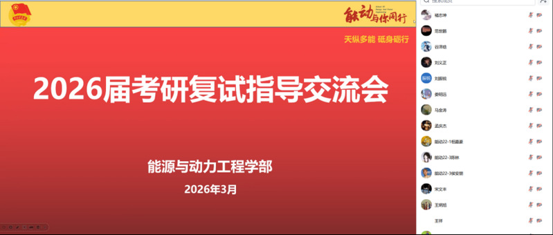 为精准助力学部2026届考研学子备战复试,3月15日,能源与动力工程学部举办线上考研复试指导交流会。会议邀请了学部2025届优秀校友、现攻读北京理工大学研究生的刘义正同学担任主讲,毕业班辅导员及2026届考研学生参加了交流会。